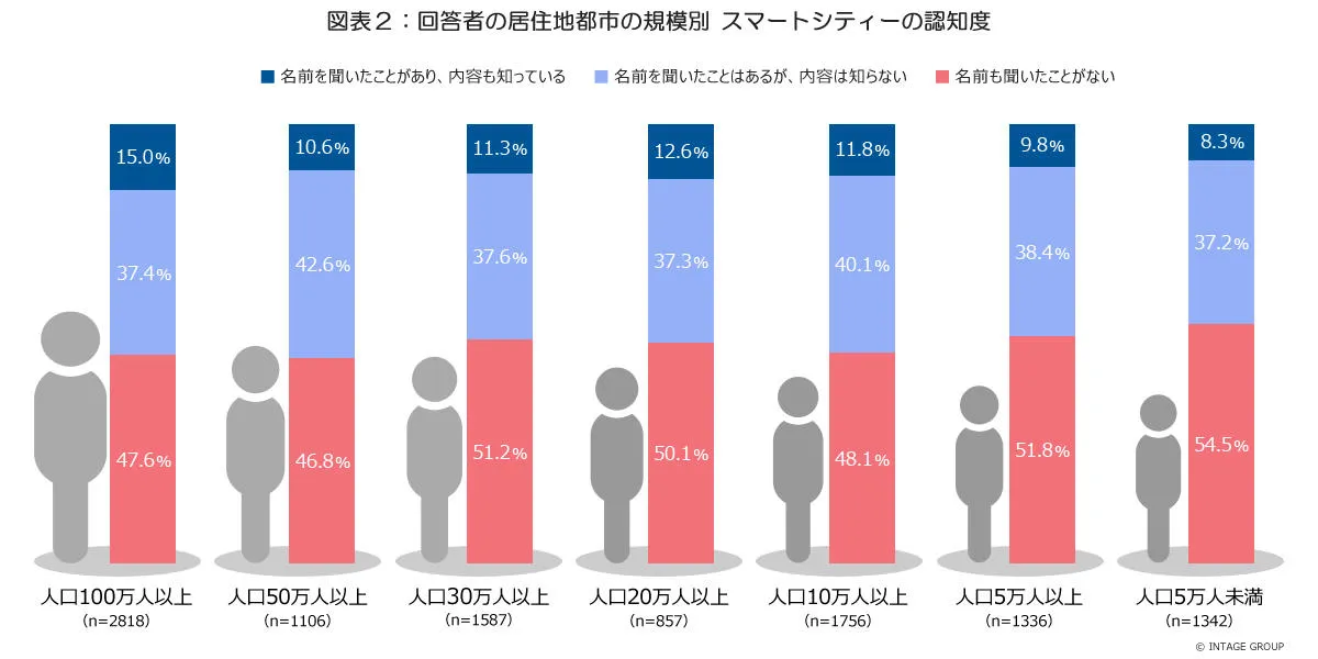 人口が100万人以上の都市には、スマートシティーを推進している東京都特別区(港区など)、横浜市、札幌市、京都市、さいたま市が含まれます。そのため、回答者の住んでいる自治体の地域性などが、スマートシティーの内容まで知っている割合に関係があるのではないかと考えられます。