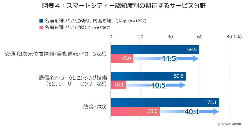 さらに、スマートシティーについて「名前を聞いたことがあり、内容も知っている人」と「名前も聞いたことがない人」では、「交通(3次元位置情報・自動運転・ドローンなど)」、「通信ネットワークとセンシング技術(5G、レーザー、センサーなど)」に加え、「防災・減災」への期待で特に差が大きいことが分かりました。